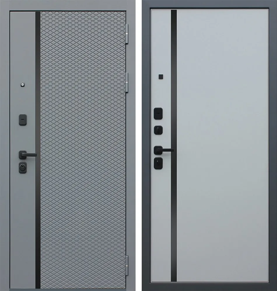 Порошковое покрытие Муар Серый Экошпонированная панель МДФ 10 мм (дизайн ФЛС). Цвет "ясень графит". Объемная фрезеровка. Вертикальная вставка из черного глянцевого лакобеля. Наличник МДФ 80 мм.